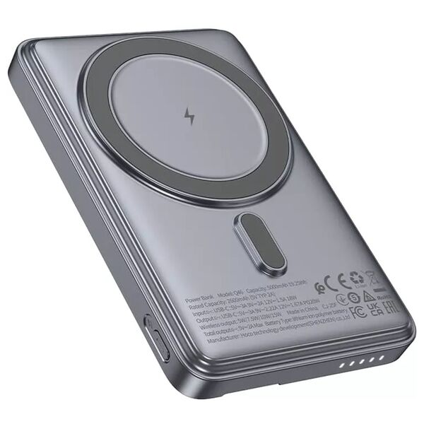 Cветодиодный индикатор показывает уровень заряда батареи. Мощность: USB-C: 20 Вт (PD / QC / FCC / AFC); Мощность беспроводной зарядки: 5 Вт / 7,5 Вт / 10 Вт / 15 Вт (MagSafe 7,5 Вт); Общая мощность: 5 В / 2 А