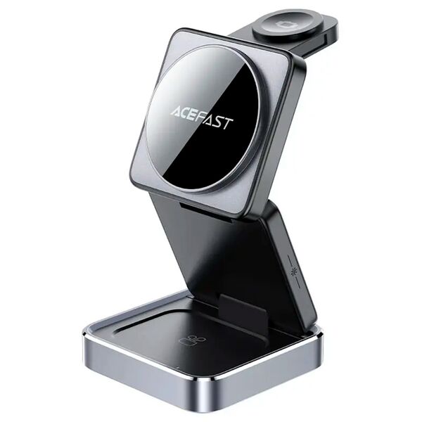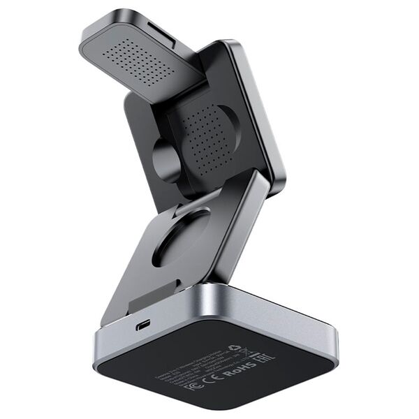 Позволяет заряжать 3 устройства одновременно(Для телефона, часов и TWS), множественные средства защиты, может использоваться как магнитный держатель для телефона, сворачивается в виде куба.