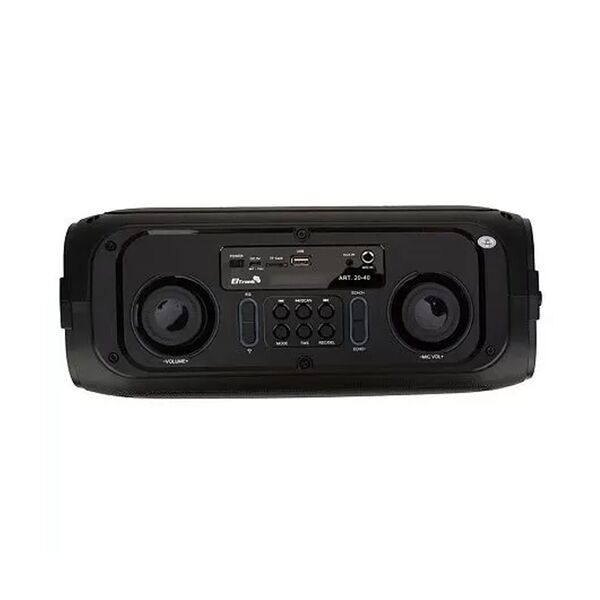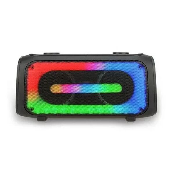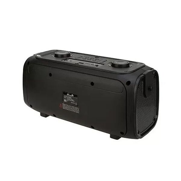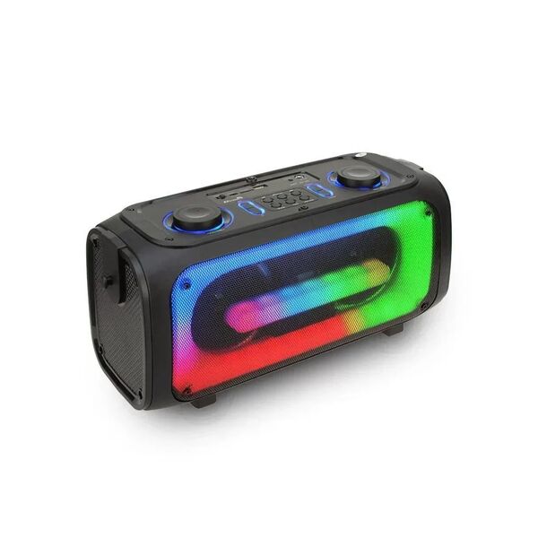 Мощность: RMS 20 Вт, PMPO 200 Вт. Встроенное FM радио. RGB-LED подсветка (активная). Дисплей. Вход для проводного микрофона (не идет в комплекте). Встроенный эквалайзер.