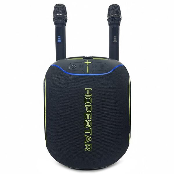 Влагозащита IPX5, RGB-подсветка, режим TWS (сопряжение двух колонок), поддержка караоке (2 беспроводных микрофона в комплекте), функция Power Bank.