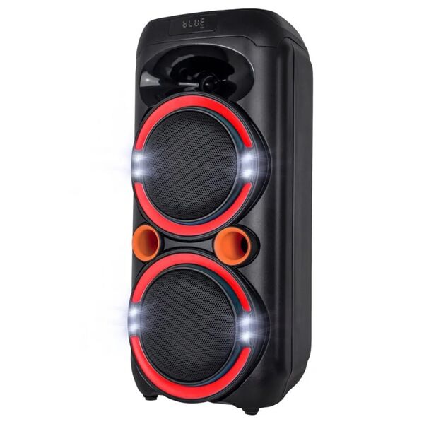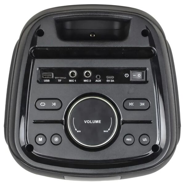 Два разъема для микрофона, звучание с максимальной мощностью в 50 Вт, FM-радио. Подсветка.