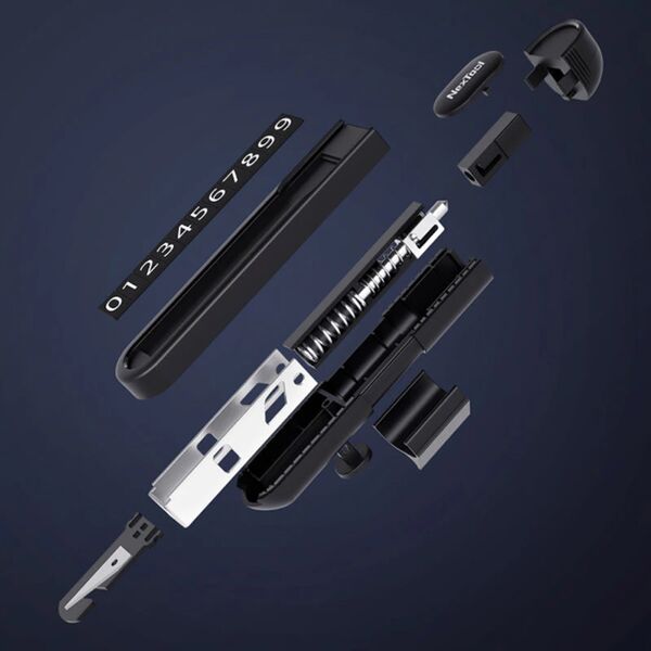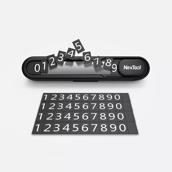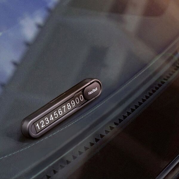 Парковочная визитка на приборную панель, сочетающая в себе табличку с номером телефона, стропорез и стеклобой. Табличка с номером телефона крепится на приборную панель под лобовым стеклом с помощью двухстороннего скотча 3М. Визитка имеет в комплекте 5 наборов магнитных пластин с цифрами от 0 до 9.