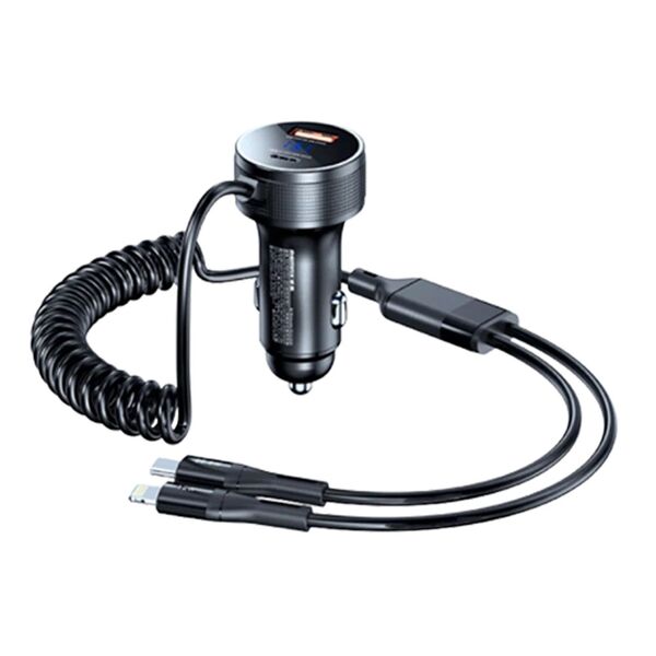 Автомобильное зарядное устройство Remax позволяет быстро и безопасно заряжать любые устройства с помощью разъема USB и Type-C, а также имеет встроенный кабель с двумя коннекторами - Lightning и Type-C длиной 50 см, которые растягиваются до 120 см