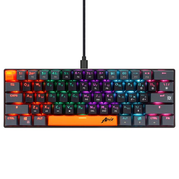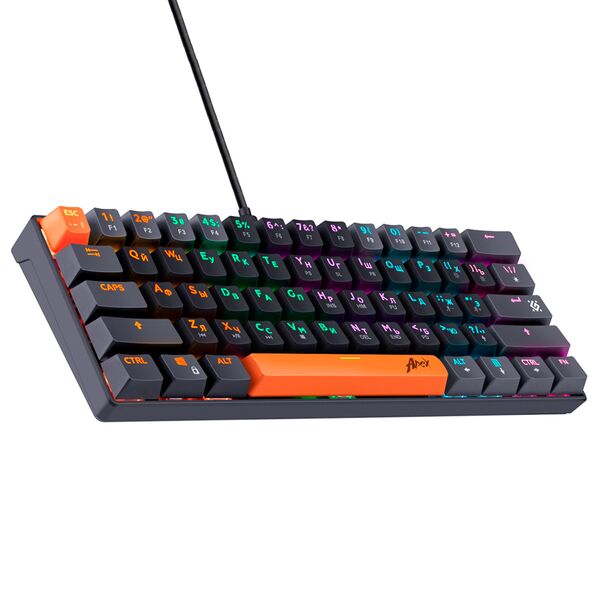 Механическая клавиатура, сила нажатия 60г, длина хода клавиш 4 мм, точка срабатывания 2м, длина кабеля 1.5 м, материал кейкапов ABS.