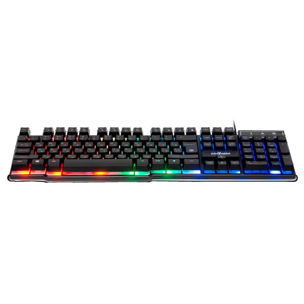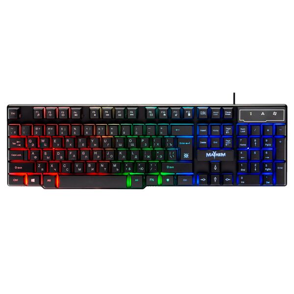 Клавиатура проводная Defender Mayhem GK-360DL с мембранными клавишами и многоцветной подсветкой RGB создана для геймеров. Технология одновременного распознавания до 19 нажатий обеспечивает высокую точность управления игровым процессом. Клавиши отличаются быстрым откликом и тихим ходом. В оснащение клавиатуры входят цифровой блок и панель горячих клавиш. Конструкция клавиатуры отличается устойчивостью к влаге и повреждениям.