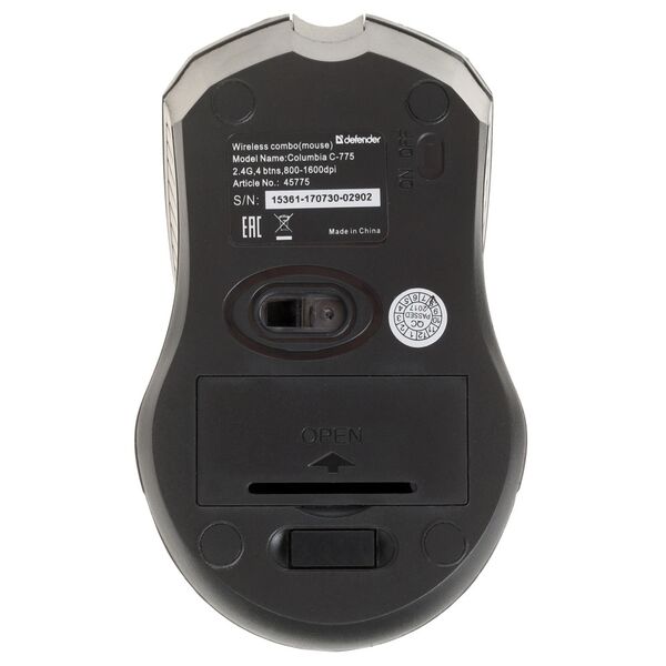 Компьютерная мышь из набора Defender Columbia C-775 получила полностью симметричный дизайн, поэтому ею одинаково удобно управлять как правой, так и левой рукой. Она имеет в корпусе отсек для хранения миниатюрного USB-ресивера, осуществляющего прием беспроводного сигнала, и поддерживает изменение разрешения датчика в диапазоне 800-1600 dpi. Укомплектованные необходимыми для работы батарейками клавиатура и мышь могут взаимодействовать с ПК на расстоянии до 10 метров.