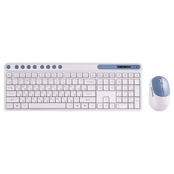 Полноразмерная клавиатура с цифровым блоком и эргономичная беспроводная мышь. Комплект работает от одного общего USB-ресивера, что экономит порты в компьютере. Мышь имеет симметричную форму, подходящую для работы как правой, так и левой рукой. Стабильная связь на расстоянии до 10 метров.