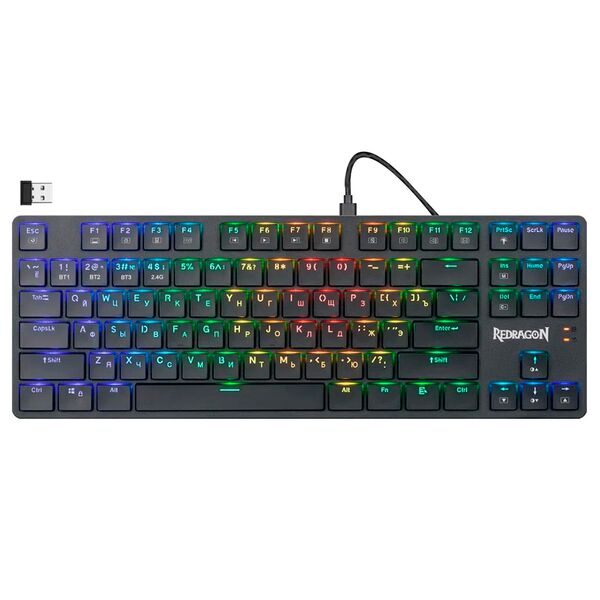 Переключатели OUTEMU+BROWN, материал кейкапов ABS, длина кабеля 1.8 м, тихий ход клавиш, RGB подсветка, три режима подключения(провод, радиоканал, Bluetooth), индикатор заряда аккумулятора, технология Hot Swap, позолоченный USB-коннектор, низкопрофильные клавиши.