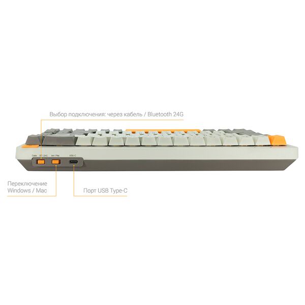 Это механическая беспроводная клавиатура. Клавиатура имеет три режима работы, что позволяет выбирать наиболее удобный режим в зависимости от потребностей пользователя. С 68 клавишами она обеспечивает компактность и удобство использования. Клавиатура имеет три режима подключения. Клавиши с возможностью быстрой замены. Вы можете с легкостью менять клавиши, чтобы создать свою собственную уникальную механическую клавиатуру. Качественно нанесенные, четкие и ровные буквы и подсветка клавиатуры обеспечивает комфортное пользование, а полностью русифицированная раскладка позволяет легко печатать на русском языке без каких-либо проблем.