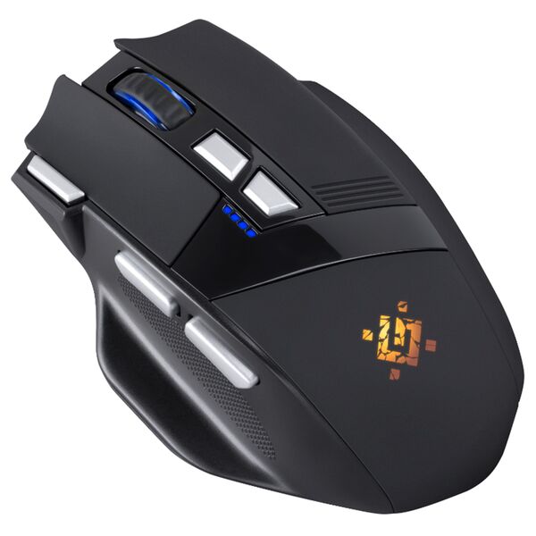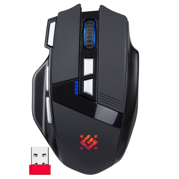 Режим разрешения 1200/2400/3200 dpi, кнопка FIRE для шутеров, 2 дополнительные боковые кнопки, бесшумное нажатие кнопок, отсек в корпусе мыши для хранения приемника, RGB подсветка, возможность выключения подсветки, подставка под большой палец, тефлоновые ножки, программное обеспечение Defender Game Center.