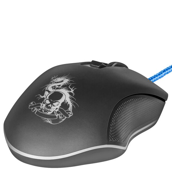 Мышь проводная предназначена преймущественно для гейминга. Оптический светодиодный сенсор устройства работает в разных режимах. Изготовлена из черного пластика и имеет противоскользящее покрытие со стилизованным рисунком. Использовать устройство можно и правой, и левой руками.