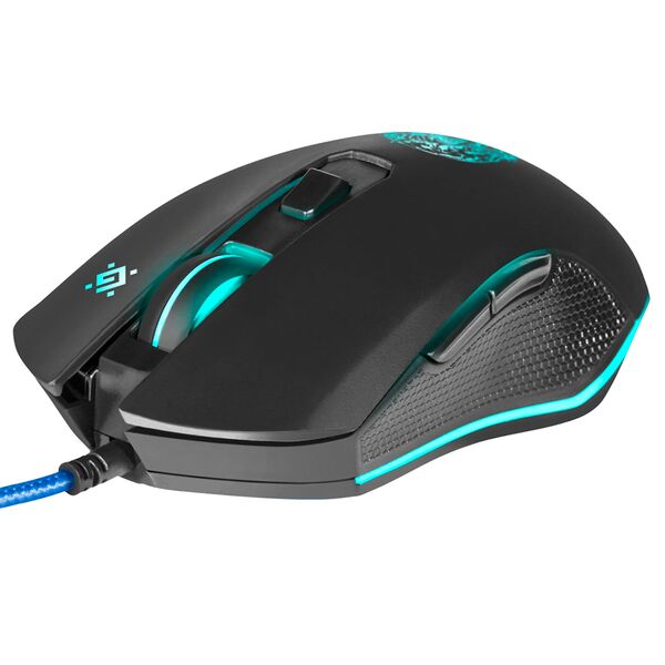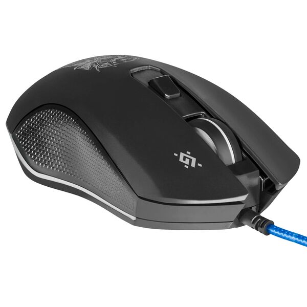 Поддержка макросов, разрешение сенсора dpi 800/1600/2400/4800/6400/12800, тефлоновые ножки, RGB подсветка, коврик в комплекте 220 х 180 х 3 мм, 2 боковые кнопки, ферритовый фильтр помех, 5 программируемых кнопок, программное обеспечение Defender Game Center.