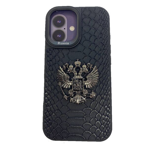 Чехол для iPhone 16 накладка кожа Герб России Черный