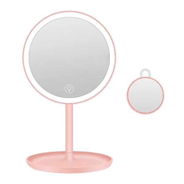 Косметическое зеркало оснащено высококачественной системой светодиодного освещения. Предусмотрено 3 режима яркости – лунный (120Лм), классический (280Лм) и солнечный (525 Лм). Интенсивность освещения регулируется с помощью сенсорной кнопки, расположенной в нижней части зеркала. С тыльной стороны корпуса зеркала встроено съемное портативное зеркало с 5-кратным увеличением, которое с помощью магнита крепиться на основное зеркало.