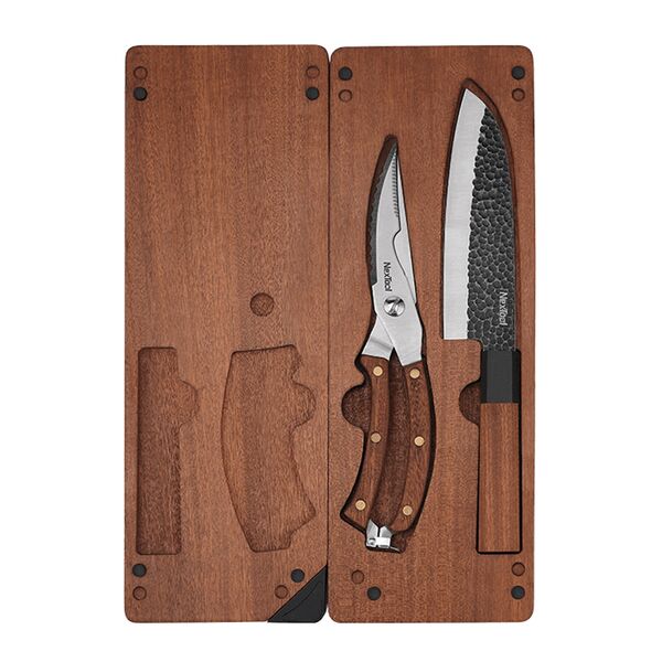 Доска набора изготовлена из твердой древесиной цельного дерева и тщательно отполирована, имеет стабильную структуру, яркий цвет и покрыта защитным маслом из древесного воска. Обеспечивает долговечность даже при использовании на открытом воздухе и попадании влаги. Разделочная доска оснащена несколькими магнитами, благодаря которым кухонный нож и ножницы плотно прилегают к поверхности. Тип ножа Santoku- это классический нож для обработки мяса, рыбы, фруктов, овощей и тд. Ножницы изготовлены из высококачественной стали и прошли множество процессов полировки. В разделочную доску так же интегрирована точилка для ножей.