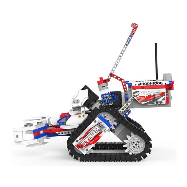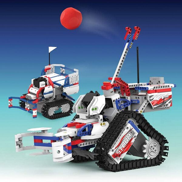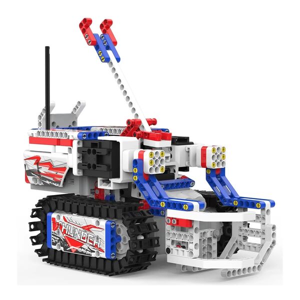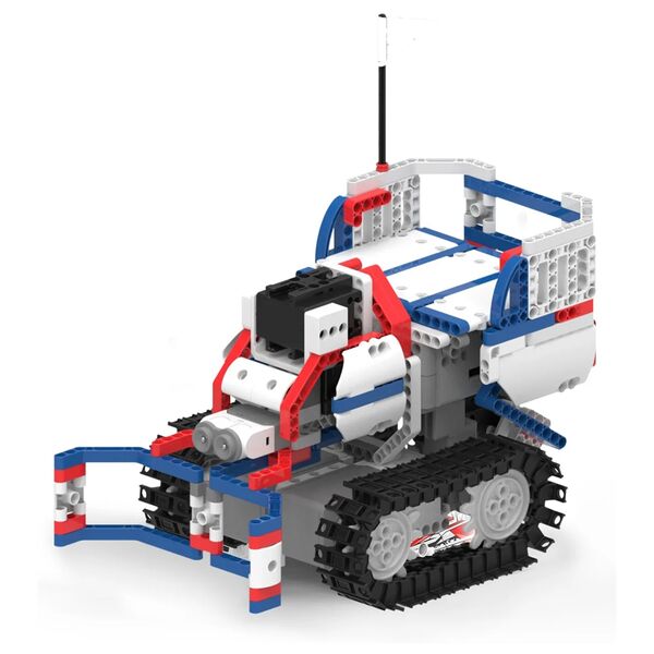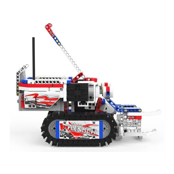 В комплект входят: 1 ультразвуковой датчик, 3 мотора для плавного движения робота, 2 скоростных мотора постоянного тока, 1 главный блок управления. Поддерживает язык кодирования Blockly, собранные модели взаимодействуют с приложением Jimu, в котором можно реализовать сценарии игры с роботами.