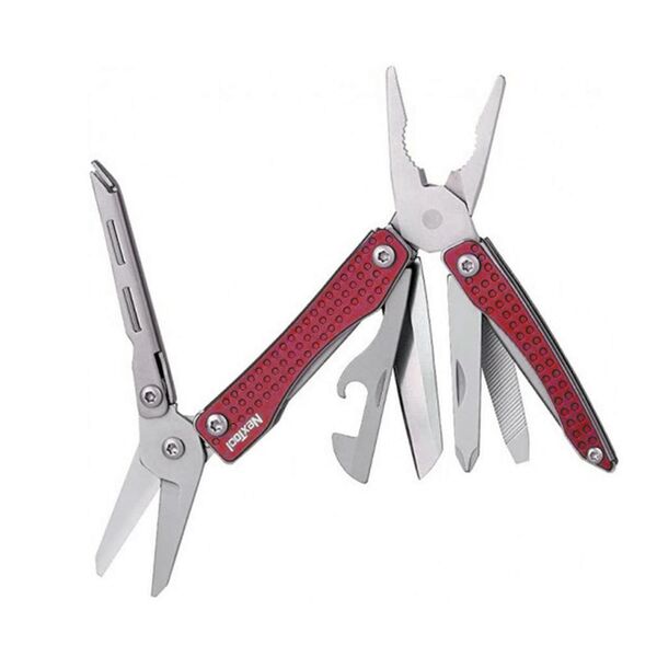 Плоскогубцы, нож, плоская и крестообразная отвертка, открывалка для бутылок, консервный нож, кусачки для проволоки, захват для мелких деталей, надфиль, универсальный нож.