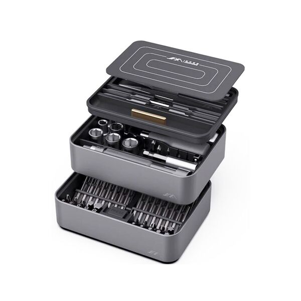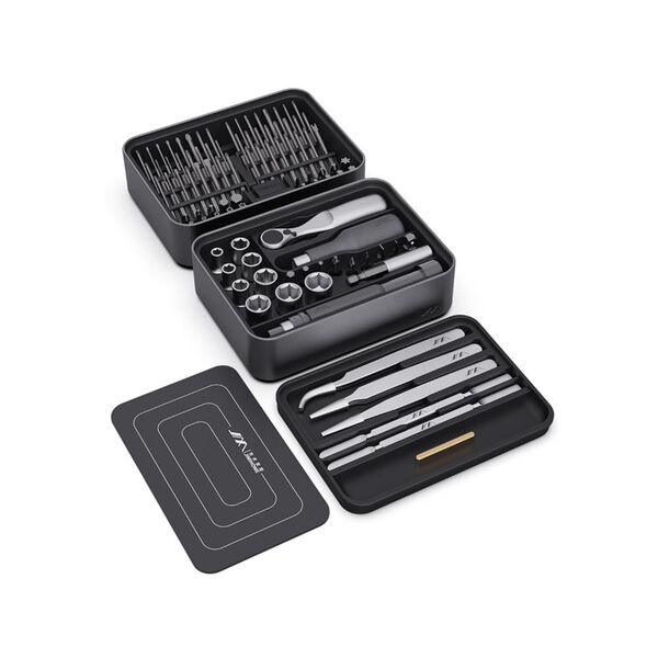 Набор отверток в удобном кейсе содержит необходимое как для домашнего ремонта, так и для профессиональных работ. В комплекте FM3 содержится 100 насадок и инструментов. Комплект состоит из магнитной доски, разного вида пинцетов, набора бит. В этой версии комплекта есть дополнительный ящик, в котором находятся дополнительные инструменты - трещоточный ключ, ADP, биты 6.35 мм, торцевые головки.