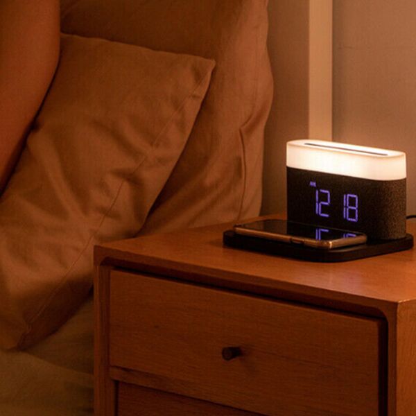 Цифровые часы-будильник, беспроводная зарядка и ночной светильник. Устройство имеет 4 кнопки, два громкости будильника. Ночной светильник имеет 3 цветовые температуры, яркость от 5-100%. Также есть функция памяти, чтобы сохранить настройки яркости. На правой стороне будильника есть сенсорный выключатель.