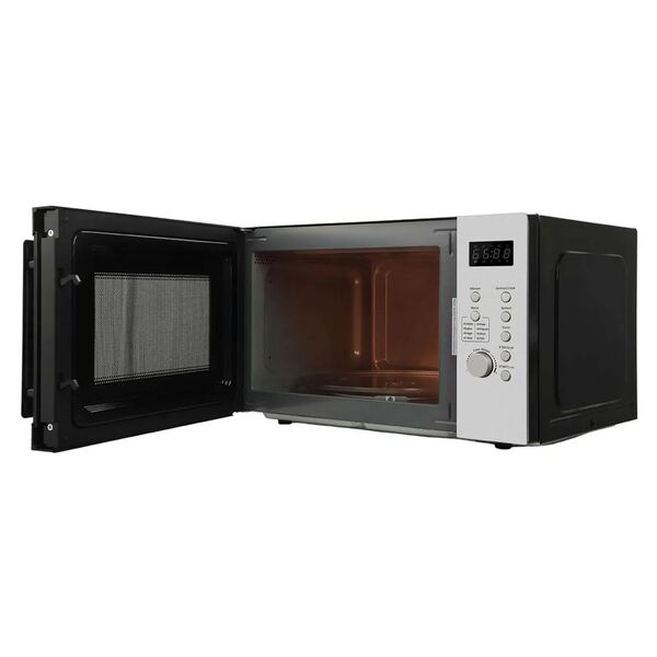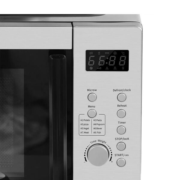 Управление осуществляется с помощью механических кнопок. Дверца открывается посредством ручки эргономичной формы. Благодаря большому объему камеры 28 л удобно разогревать значительную порцию еды за один раз. На цифровом дисплее отображается таймер и текущие настройки. Поворотный стол изготовлен из стекла, которое способно выдержать нагрузки. Легко очищается внутреннее покрытие. Возможность расмораживания по весу и по таймеру. Детский замок. Умный разогрев. 8 предустановленных режимов. Мощность 900 Вт.