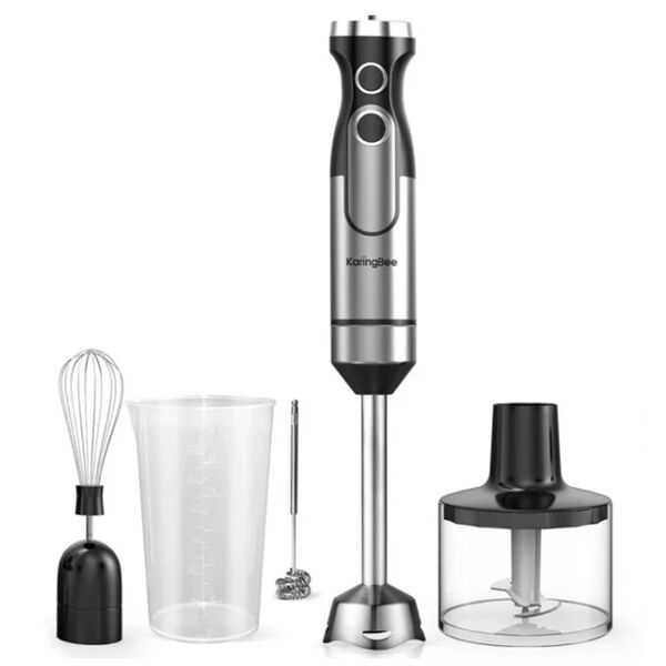 Блендер оснащен 5 скоростями, что позволяет выбрать оптимальный режим работы для каждого вида продуктов. В комплекте с блендером поставляются контейнер для фарша, мерный стакан, венчик и капучинатор, что делает его универсальным инструментом для приготовления различных блюд. Длина кабеля составляет 1 метр, что обеспечивает удобство при использовании. Максимальное количество вращений 22000 об/мин. Защита от перегрева и от перегрузки.