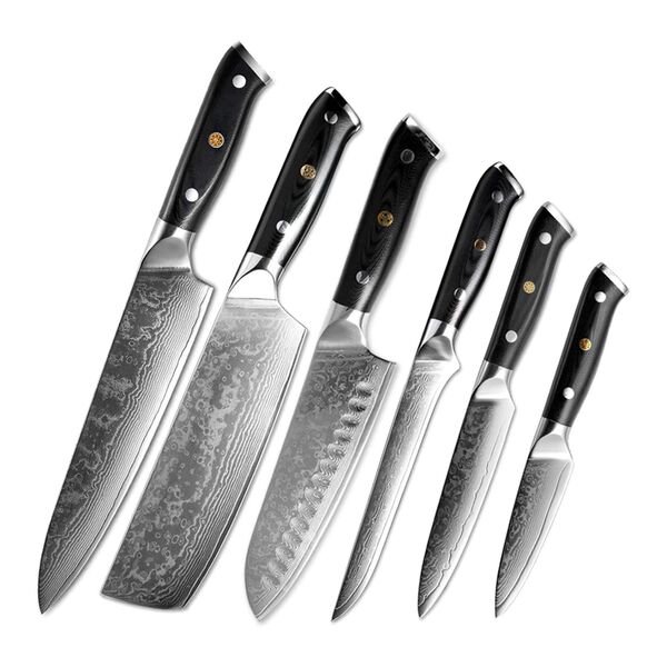 В комплект входит 6 ножей: обвалочный, шеф-нож, накири, сантоку, универсальный и нож для овощей. Толщина лезвия составляет 3 миллиметра, а длина, в зависимости от ножа – от 19 до 34 сантиметров.