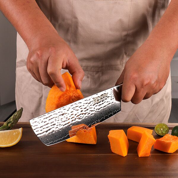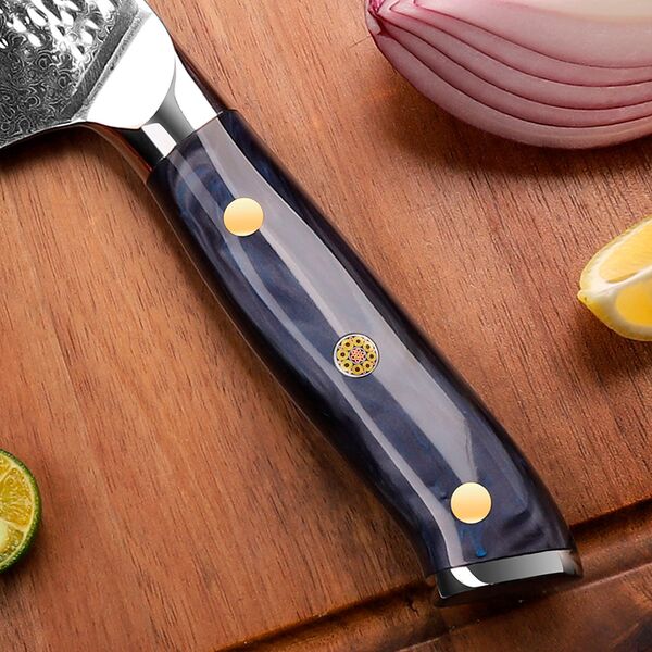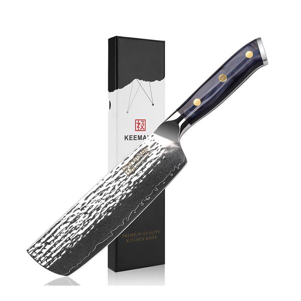 Профессиональный кухонный нож накири от Keemake – это премиальный нож серии Blue Gem, изготовленный по старинной дамасской технологии с сердечником из высокоуглеродистой стали V Gold-10 и высокой твердостью по Роквеллу – 60 HRC. Нож накири предназначен не только для нарезки фруктов и овощей, но и для быстрой шинковки всех видов корнеплодов, а также подходит для мелкой нарезки мяса и зелени. Нож накири от Keemake имеет широкой клинок с тонкой режущей кромкой и сбалансированный вес. Широкий клинок длиной 178 мм позволяет не только уверенно работать с луком или листьями салата, но ему по силам и тыква, и редька дайкон, и мясо, и рыба, а также другие продукты гастрономии. Кроме того, клинком можно работать и как лопаткой для перекладывания нарезки с разделочной доски в миски.