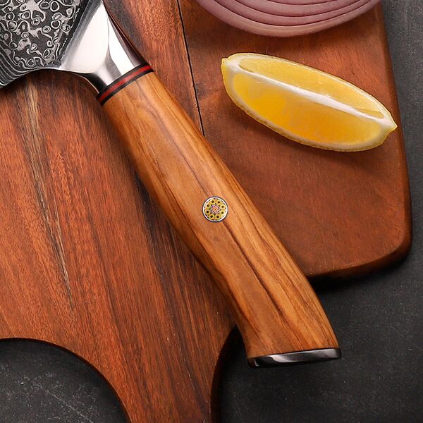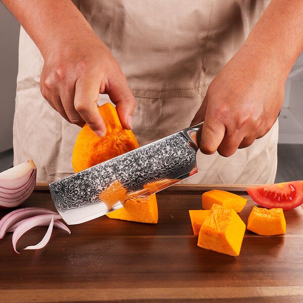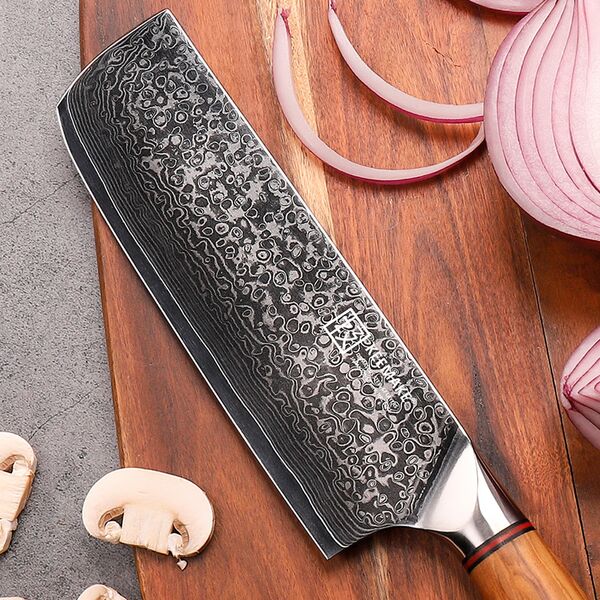 Профессиональный кухонный нож накири от Keemake – это премиальный нож серии Blue Gem, изготовленный по старинной дамасской технологии с сердечником из высокоуглеродистой стали V Gold-10 и высокой твердостью по Роквеллу – 60 HRC. Нож накири предназначен не только для нарезки фруктов и овощей, но и для быстрой шинковки всех видов корнеплодов, а также подходит для мелкой нарезки мяса и зелени. Нож накири от Keemake имеет широкой клинок с тонкой режущей кромкой и сбалансированный вес. Широкий клинок длиной 178 мм позволяет не только уверенно работать с луком или листьями салата, но ему по силам и тыква, и редька дайкон, и мясо, и рыба, а также другие продукты гастрономии. Кроме того, клинком можно работать и как лопаткой для перекладывания нарезки с разделочной доски в миски.