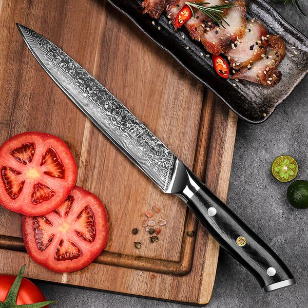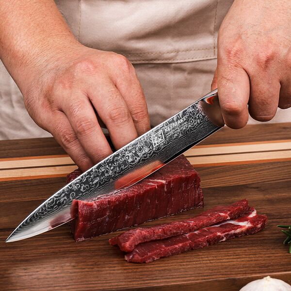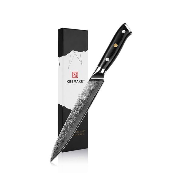 Профессиональный разделочный нож от Keemake – это премиальный нож из серии Classic, изготовленный по старинной дамасской технологии с сердечником из высокоуглеродистой стали V Gold-10 и высокой твердостью по Роквеллу – 60 HRC. Дополнительно каждый нож из этой серии оснащен больстером и навершием из нержавеющей стали. Разделочный нож Keemake предназначен для разделки любого вида мяса, такого как домашняя птица, различные виды красного мяса, включая дичь, и даже рыбы. Им также удобно снимать кожу с мяса, срезать хрящи и удалять сухожилия.