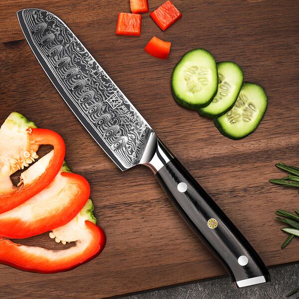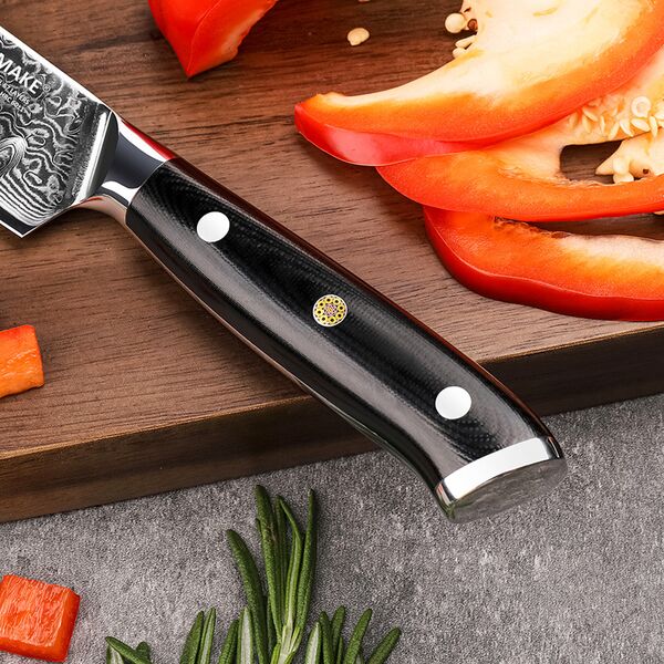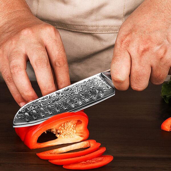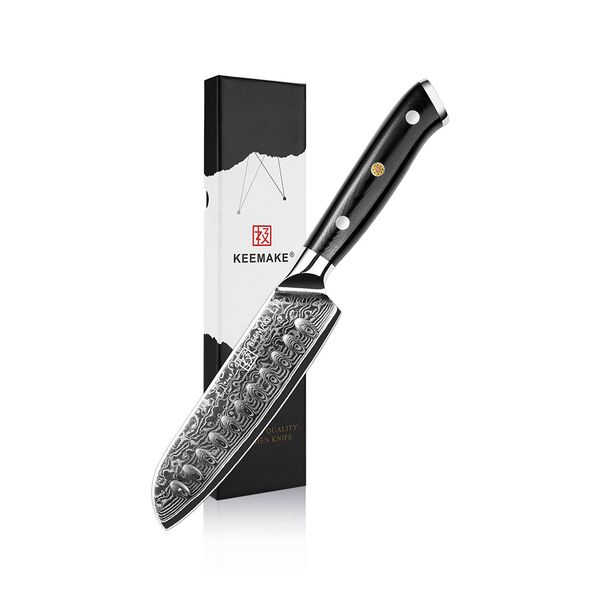 Профессиональный малый нож сантоку от Keemake – это премиальный нож серии Classic малого размера, изготовленный по старинной дамасской технологии с сердечником из высокоуглеродистой стали V Gold-10 и высокой твердостью по Роквеллу – 60 HRC. Для серии Classic характерно сочетание элегантного лаконичного дизайна и отличных рабочих характеристик. Нож сантоку предназначен не только для быстрой шинковки всех видов овощей, но и для активной работы с зеленью, мясом и любыми продуктами гастрономии. Нож сантоку от Keemake имеет широкой клинок со сверхострой кромкой и идеально сбалансированный вес. Широкий клинок позволяет не только уверенно работать с луком или листьями салата, но ему по силам и тыква, и редька, и мясо, и рыба. Кроме того, клинком можно работать и как лопаткой для перекладывания нарезки с разделочной доски в миски. Нож сантоку – это многопрофильный клинок, который можно считать универсальным, он подходит для мяса, овощей, зелени, грибов и для многих других продуктов.
