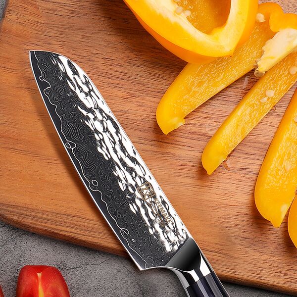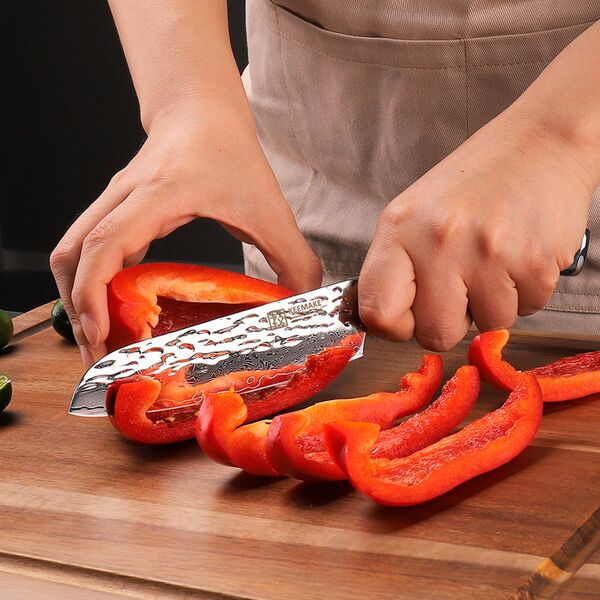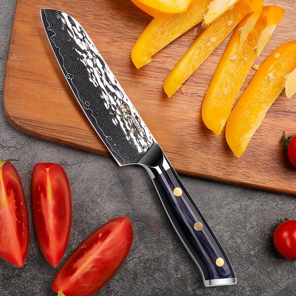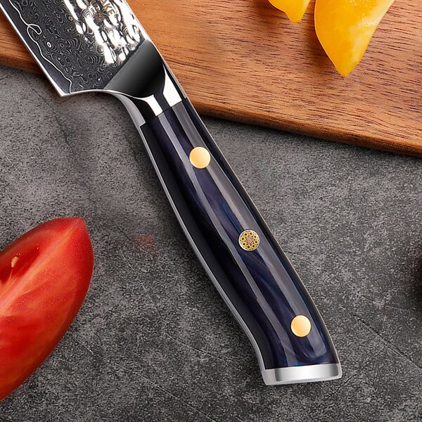 Профессиональный малый нож сантоку от Keemake – это премиальный нож серии Blue Gem малого размера, изготовленный по старинной дамасской технологии с сердечником из высокоуглеродистой стали V Gold-10 и высокой твердостью по Роквеллу – 60 HRC. Для серии Blue Gem характерно сочетание элегантного лаконичного дизайна и отличных рабочих характеристик. Нож сантоку предназначен не только для быстрой шинковки всех видов овощей, но и для активной работы с зеленью, мясом и любыми продуктами гастрономии. Нож сантоку от Keemake имеет широкой клинок со сверхострой кромкой и идеально сбалансированный вес. Широкий клинок позволяет не только уверенно работать с луком или листьями салата, но ему по силам и тыква, и редька, и мясо, и рыба. Кроме того, клинком можно работать и как лопаткой для перекладывания нарезки с разделочной доски в миски. Нож сантоку – это многопрофильный клинок, который можно считать универсальным, он подходит для мяса, овощей, зелени, грибов и для многих других продуктов.