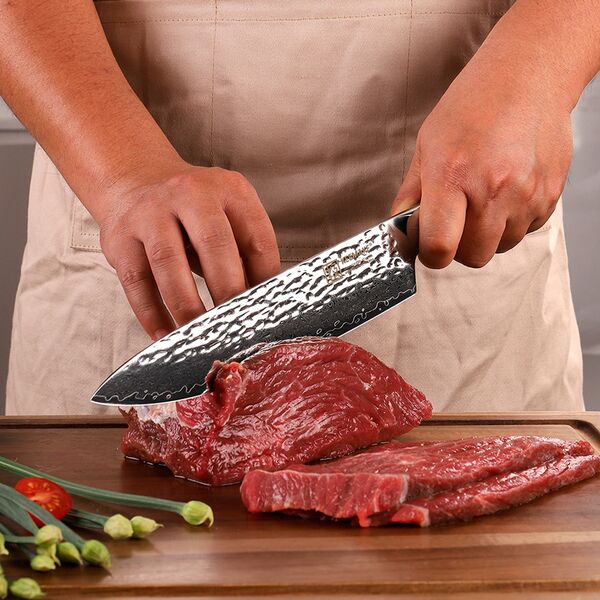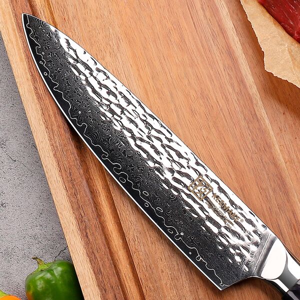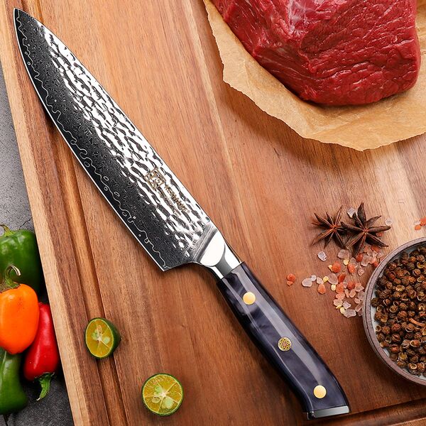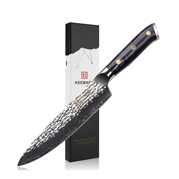 Профессиональный кухонный шеф нож от Keemake – это классический нож из серии Blue Gem, изготовленный по старинной дамасской технологии с сердечником из высокоуглеродистой стали V Gold-10 и высокой твердостью по Роквеллу – 60 HRC. Дополнительно каждый нож из этой серии оснащен больстером и навершием из нержавеющей стали. Шеф нож Keemake предназначен не только для быстрой шинковки всех видов овощей, но и для активной работы с зеленью, мясом и любыми продуктами гастрономии. Шеф нож от Keemake имеет широкой клинок со сверхострой кромкой и идеально сбалансированный вес. Широкий клинок длиной 200 мм позволяет не только уверенно работать с луком или листьями салата, но ему по силам и тыква, и редька, и мясо, и рыба. Кроме того, клинком можно работать и как лопаткой для перекладывания нарезки с разделочной доски в миски.