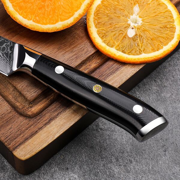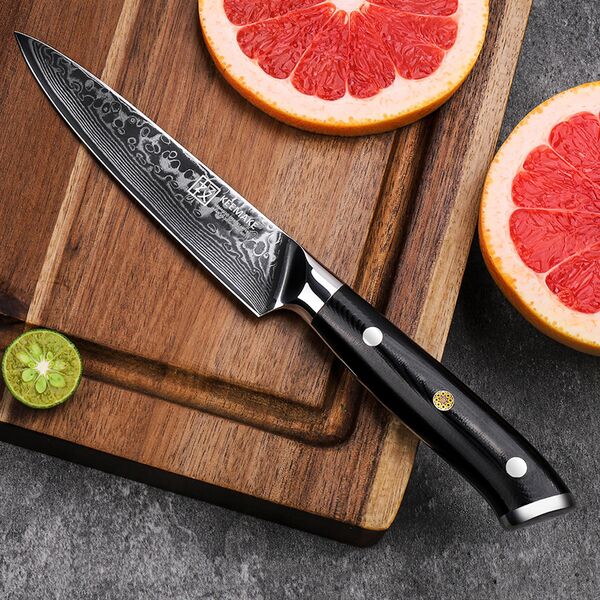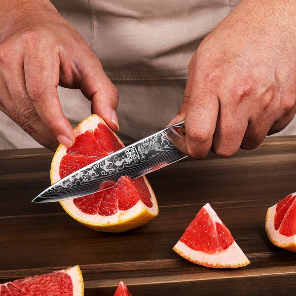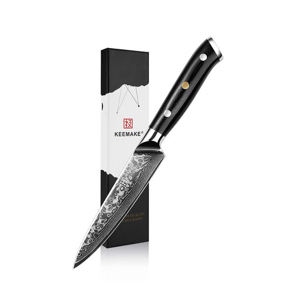 Кухонный универсальный нож от Keemake – это профессиональный нож из серии Classic, изготовленный по старинной дамасской технологии с сердечником из высокоуглеродистой стали V Gold-10 и высокой твердостью по Роквеллу – 60 HRC. Дополнительно каждый нож из этой серии оснащен больстером и навершием из нержавеющей стали. Универсальный нож Keemake предназначен для любых подготовительных работ: очистки и нарезания овощей, корнеплодов, шинкования зелени и любых мясных продуктов. Особенность универсального кухонного ножа Keemake – это простота в обращении.