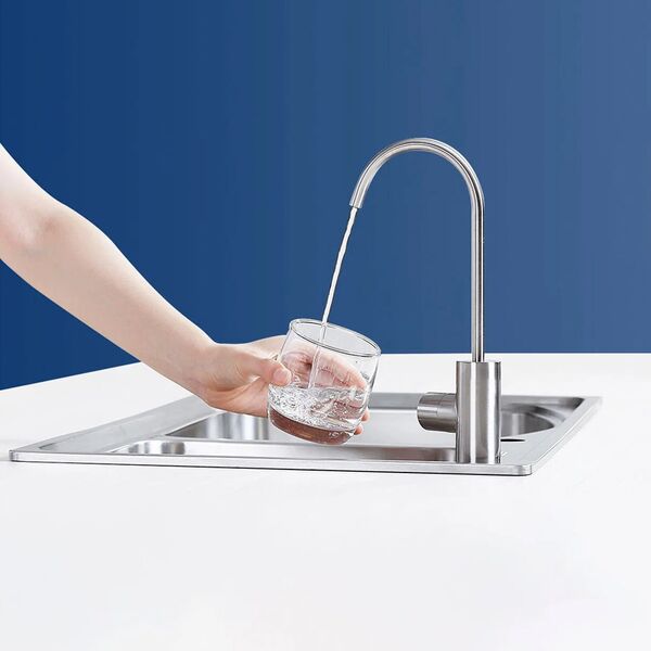Умное устройство эффективно удаляет грязь и вредные примеси из состава воды. Прибор устанавливается прямо под кухонную мойку. Смеситель имеет умное индикаторное кольцо, сообщающее пользователю о состоянии фильтров. Синий цвет означает, что вода пригодна для питья, а оранжевый - о необходимости замены фильтрующих элементов. Шестиступенчатая очистка. Фильтрующие элементы обладают длительным сроком использования. Среднее время эксплуатации фильтра обратного осмоса составляет 2-3 года, а композитного фильтра 1 год. Функции очистки: обезжелезивание, обратный осмос, очистка от бактерий, очистка от ржавчины. Помпа для повышения давления. Производительность 1.5 л/мин. Работает в системе "умный дом".