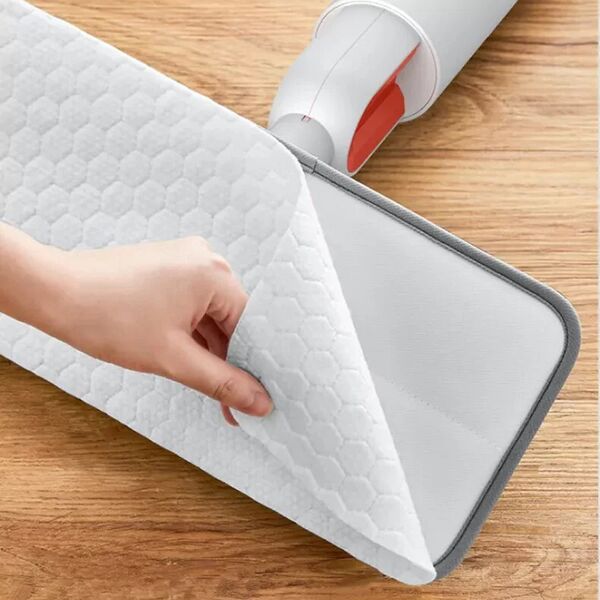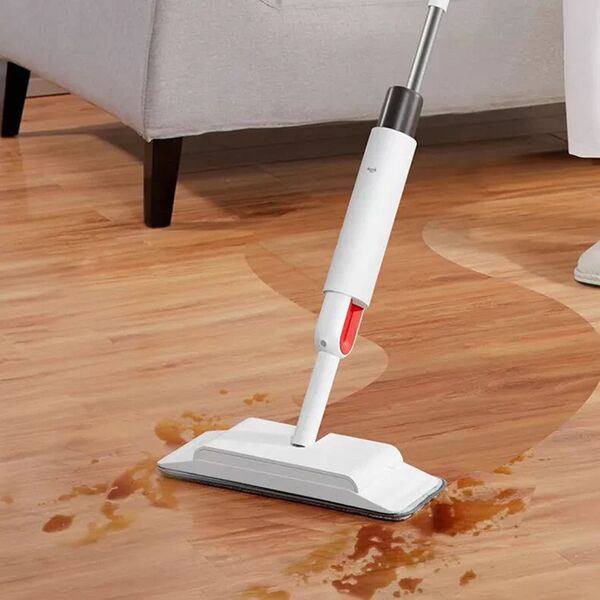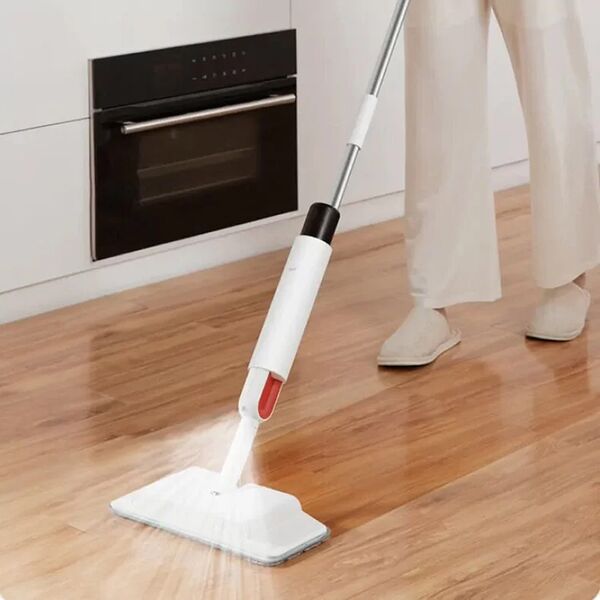 Швабра с пульверизатором. Вместимость ёмкости для воды составляет 280 мл, которой хватит для уборки 100 кв. м. При нажатии на рычаг управления, вода распыляется перед шваброй на расстояние до 110 см. Тряпка из качественного материала, в состав которого входит ворс с вкраплением пластиковой нити, легко оттирает даже старые пятна и отлично впитывает воду. Стирать ее можно как вручную, так и в стиральной машине. Она крепится на швабру с помощью пластиковых липучек. Данная конструкция не изнашивается со временем, как бы часто вы ни использовали швабру.