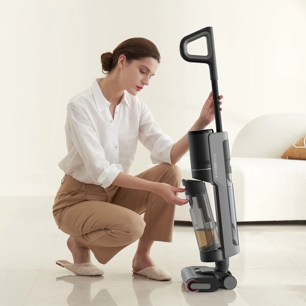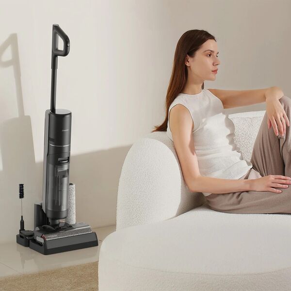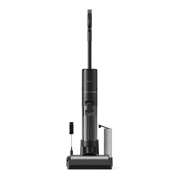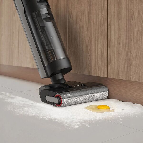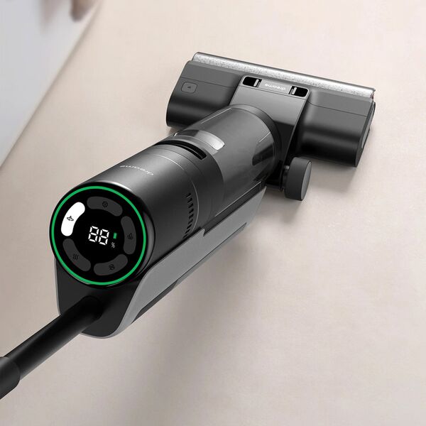 Беспроводной пылесос предназначен для сухой и влажной уборки. Безрамочная конструкция щетки не оставляет зазоров по сторонам и тщательно убирает вдоль стен. Специальный датчик, установленный в чистящую щетку, может распознавать степень загрязнения пола и автоматически включать необходимую мощность всасывания. Благодаря этой технологии снижается расход энергии на чистых участках и пылесос работает дольше. Вся необходимая информация о работе пылесоса отображается на большом LED-дисплее, а самые важные события пылесос дополнительно озвучит голосом. Три режима работы: автоматический, сбора воды и повышенной мощности. Для того чтобы предотвратить наматывание волос на роликовую щетку и налипание грязи первичная очистка щеток производится уже в процессе уборки с помощью специального скребка. А после завершения уборки можно включить полноценный режим самоочистки и сушки. Резервуар для отработанной воды вмещает до 700 мл, а чистой 900 мл.
