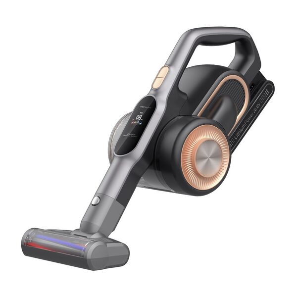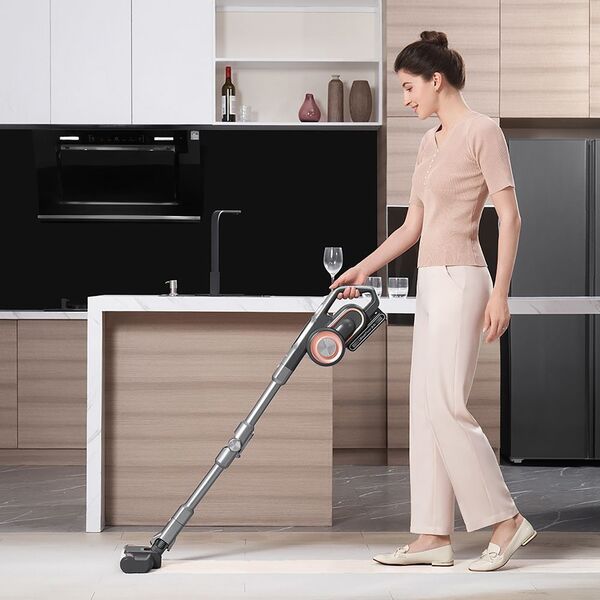 Тип уборки сухой. Объем пылесборника: 0.6 л. На рукояти располагается ползунковый переключатель, которым можно установить один из четырех вариантов работы. Пылесборник объемом 0,6 л с циклонической системой засасывания пыли легко снимается для опорожнения. Световые индикаторы отображают состояние электроприбора и показывают уровень заряда батареи. Телескопическую трубку можно отсоединять, превращая изделие в портативный модуль для очистки труднодоступных мест. Вертикальная парковка обеспечивает компактное хранение. Мощность 600 Вт. В наборе идет комплект из 5 насадок.