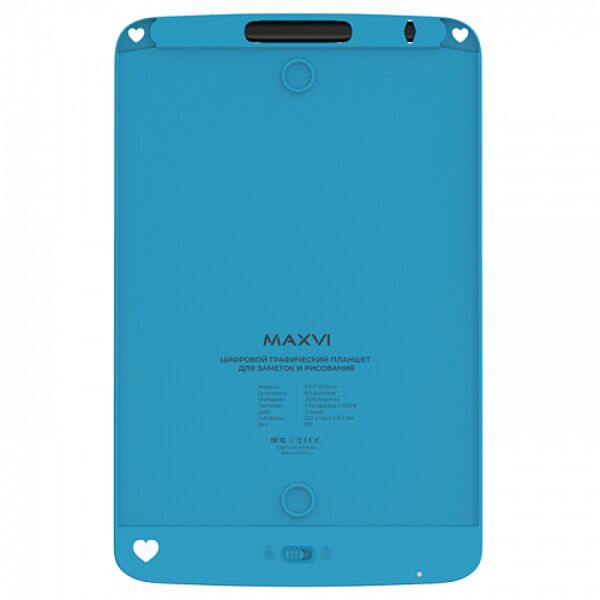 Графический планшет MGT-01 – это простое устройство, на котором удобно делать различные заметки, наброски, рисунки точно также, как на обычном листе бумаги при помощи ручки или карандаша. Дисплей планшета высокочувствителен к нажиму, а именно, при изменении силы нажатия можно рисовать линии различной толщины. При попадании яркого света на дисплей, рисунки (надписи) становятся более отчетливыми. Дисплей планшета не имеет подсветки и безопасен для вашего зрения. Планшет и стилус изготовлены из прочного и нетоксичного пластика. Устройство подходит для любых возрастов. Диагональ: 8.5”.