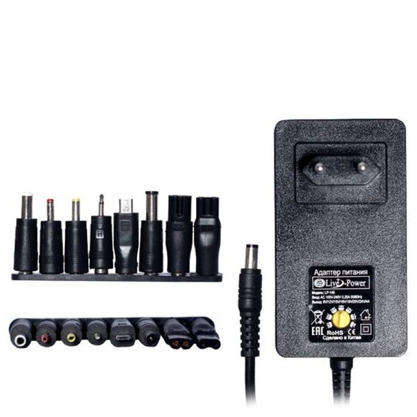 Оснащен штекером размером 5.5 мм x 2.1 мм и имеет полярность + в центре - снаружи.