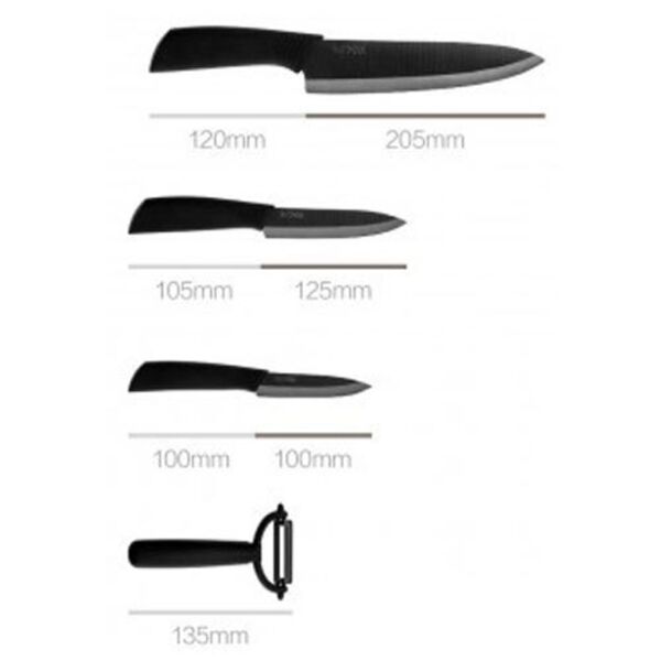 ПРИЧИНА УЦЕНКИ : В НАБОРЕ НЕТ ОДНОГО СРЕДНЕГО НОЖА. Набор ножей Huo Hou Nano Ceramic Knifes Set - это керамические ножи Huo Hou Nano Ceramic Knife, разработка и производство которых осуществлялись с помощью краудфандинга. Ножи имеют эргономичную ручку, а также не требует заточки. Форма и материал ручки позволяют безопасно удерживать нож даже жирными руками, а керамическое лезвие прошло специальную обработку, благодаря чему оно не теряет остроты. В набор входят: 3 ножа - 325 мм, 230 мм, 200 мм. 1 овощечистка - 135 мм