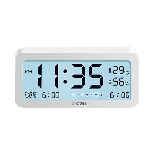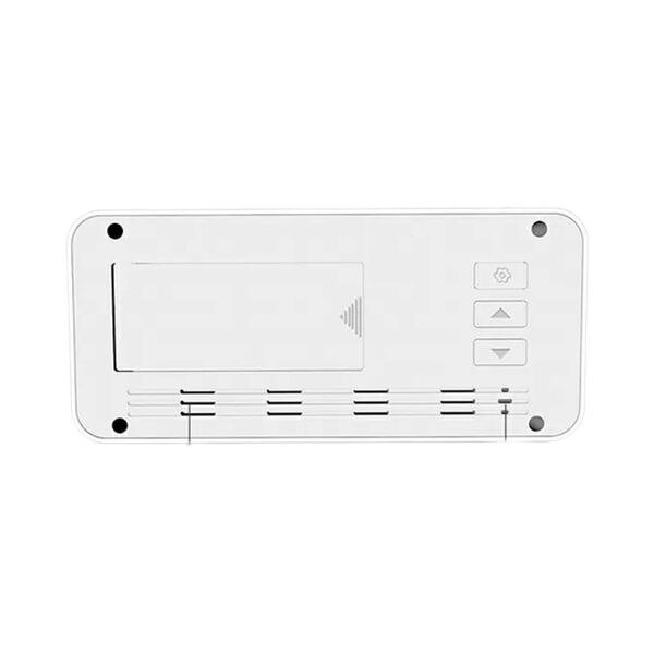 Отображает влажность, температуру, день недели и дату, имеет режим будильника.